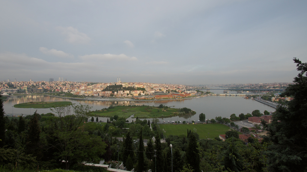 Wir sind dabei mit der Fähre von Eminönü nach Eyüp gefahren und anschließend per kurzen Fußweg über den Marktplatz weiter zur Seilbahn. Gerade noch rechtzeitig vor Sonneruntergang haben wir noch einen Sitzplatz im Restaurant mit Blick auf das Goldene Horn erhalten. Dieses hatte sich seinen Namen auch wieder einwandfrei verdient.