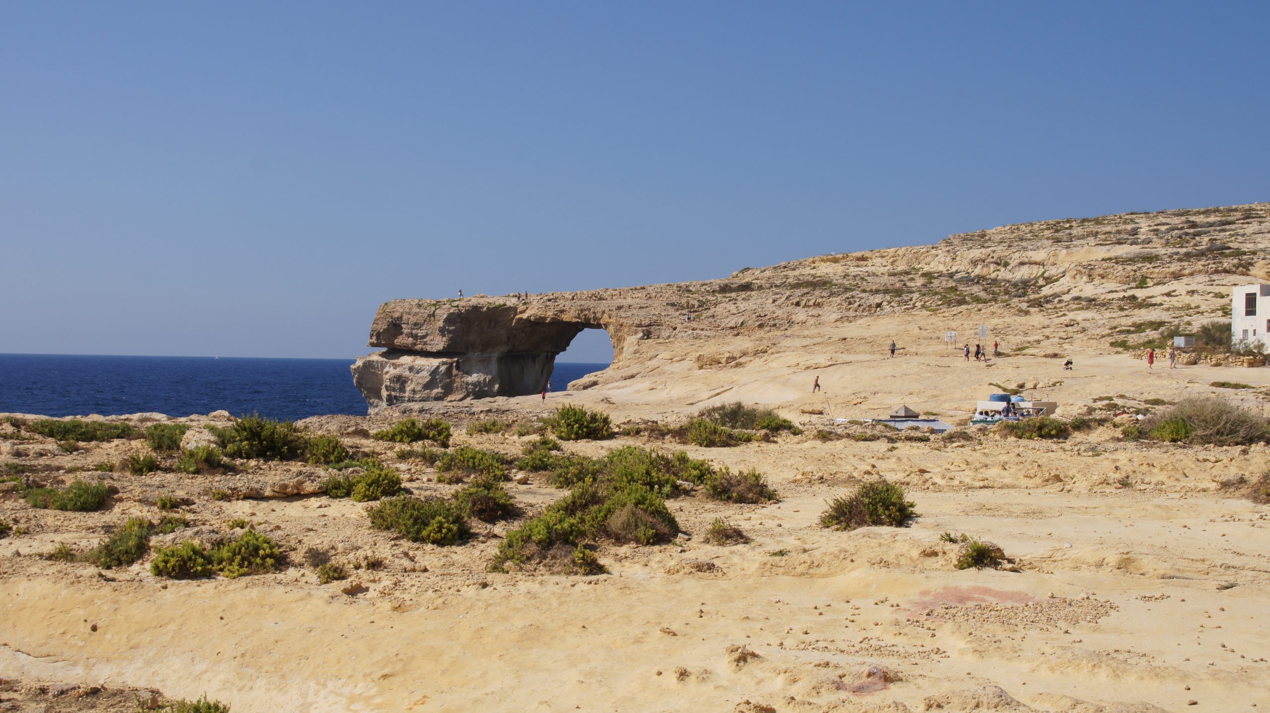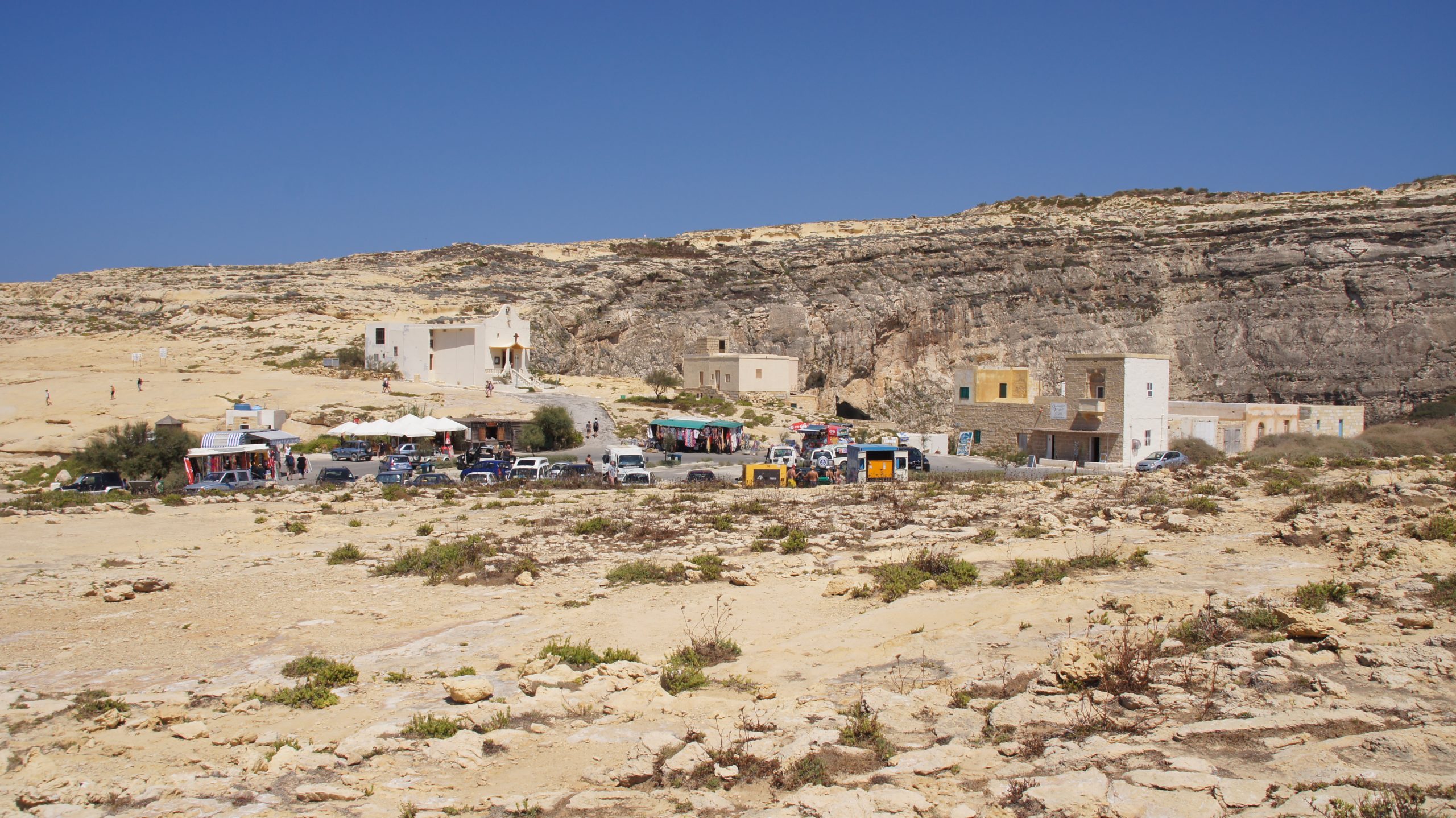 Allerdings sieht man nicht so die ganze Fläche und wenn man sich in die Schlange der Autos einreiht, merkt man erst die Geschäftigkeit. Folgt man anschließend dem Strom der Touristen auch nur mit den Augen, sieht man es: Das Azure Window.