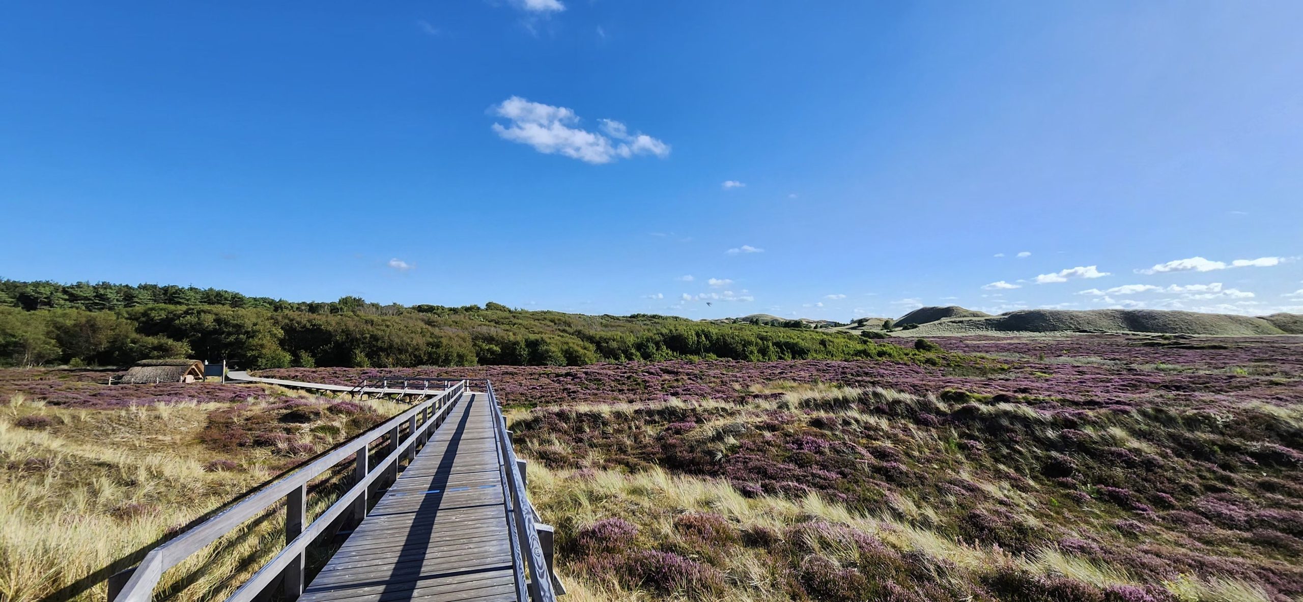 Bei 10 km Länge und 3 km Breite konnte man alles sehr gut mit dem Fahrrad erreichen. Wir haben die Nordspitze besichtigt und sind durch die Dünen an den Strand gewandert. Wir haben auf gut ausgewählten Bohlenwegen oder ausgeschilderten Wegen mitten durch die Dünen die Insel erkundet und uns auch der Heide, wie in der Lüneburger Heide, erfreut.