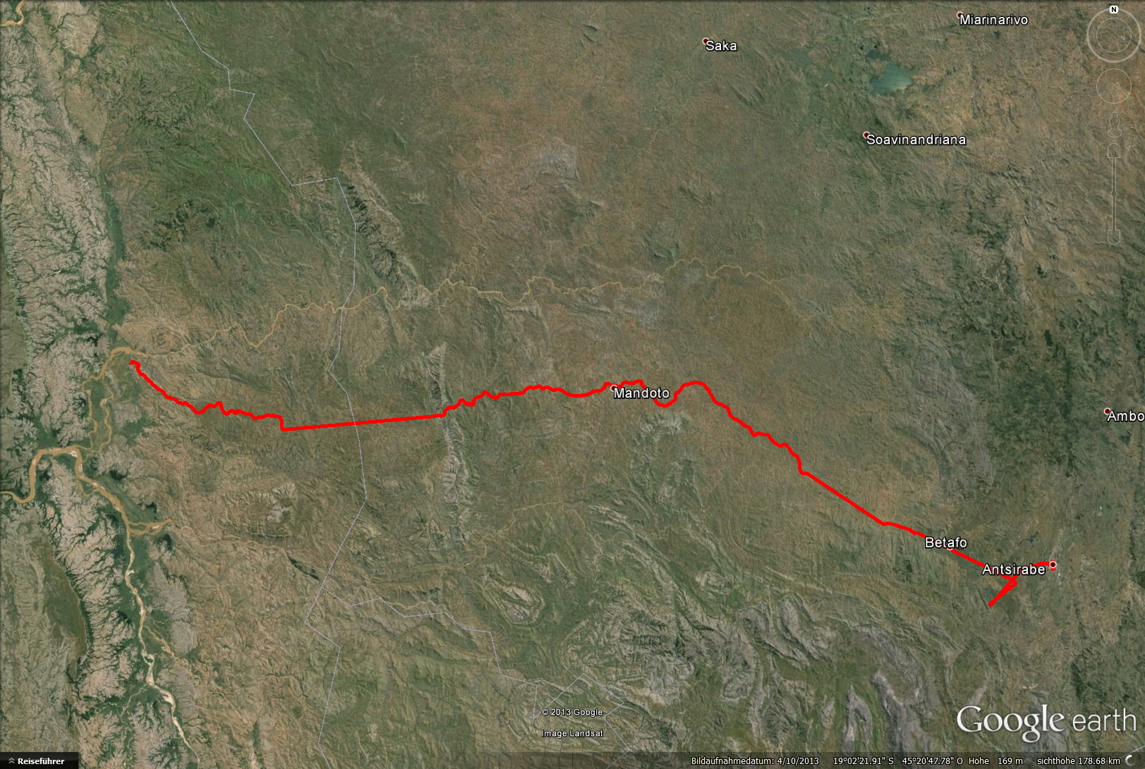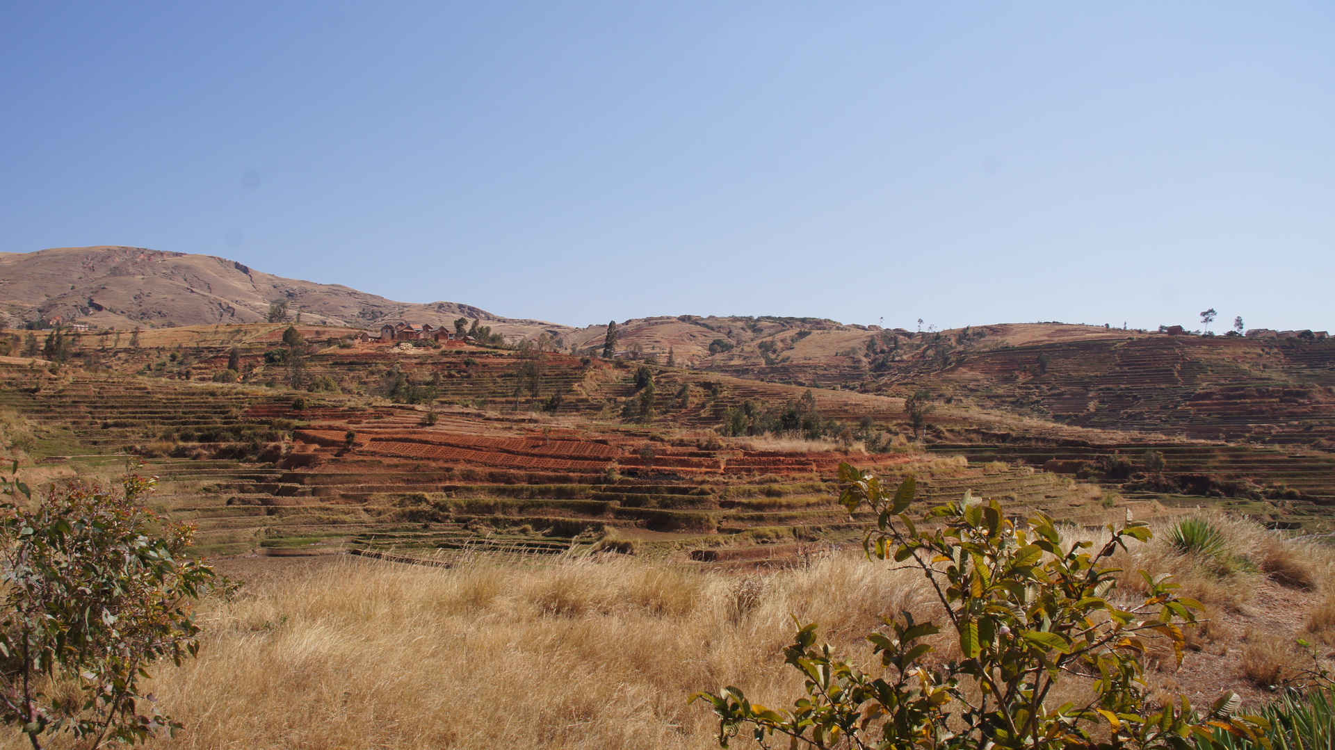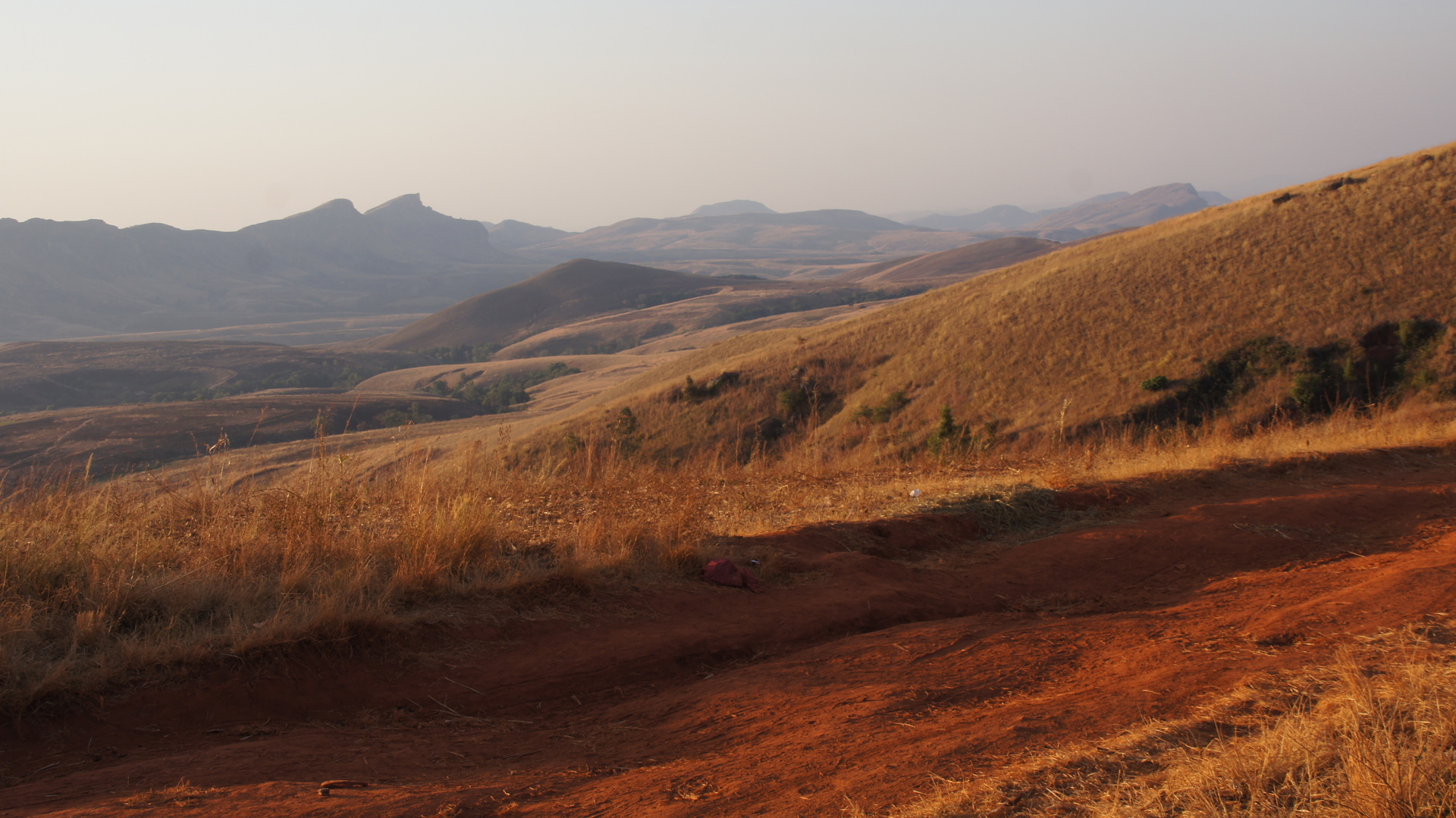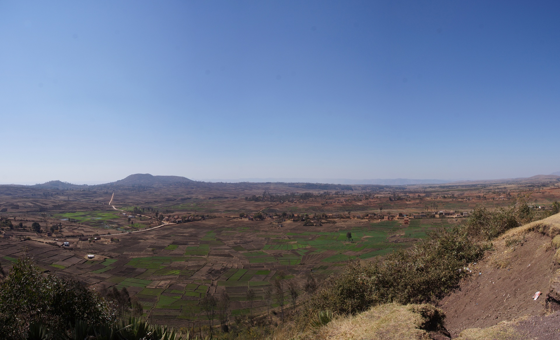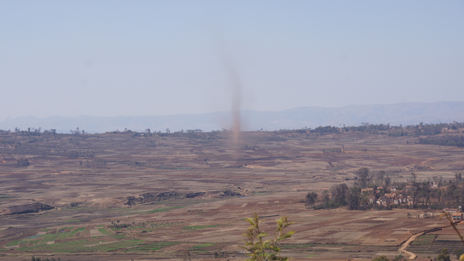 Schon bei der Hinfahrt zum Lac Tritriva ist uns streckenweise die extrem trockene Landschaft aufgefallen. Auch wenn ein großer Blick vom Vulkankegel herab in die Landschaft dieses nicht unbedingt vermuten lässt, aber ein weiterer Blick in unsere Fahrtrichtung mit dem Sandsturm spricht eigene Bände.