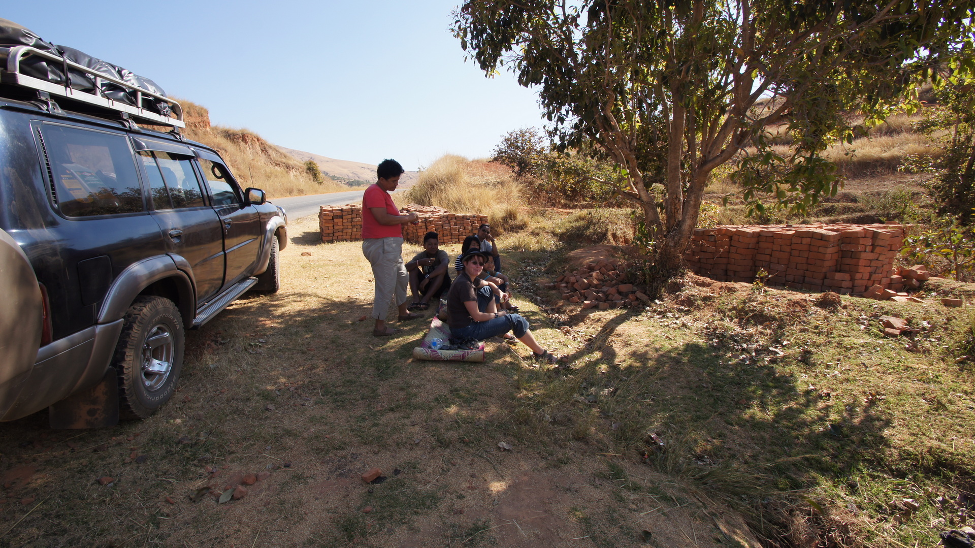 Wir haben auch einige Minuten gewartet, bis der Sturm weitergezogen ist und sind frohgelaunt ins Auto eingestiegen, um die Strecke fortzusetzen. Vorbei an Häusern und Feldern ging es gut drei Stunden ununterbrochen weiter, bis wir uns nach der größten Mittagshitze am Straßenrand zu einem kleinen Imbiss niedergelassen hatten. Es gab frisches Baguette, das wir morgens noch gekauft hatten, belegt mit Streichkäse und zum Trinken nicht mehr ganz so kaltes Wasser.