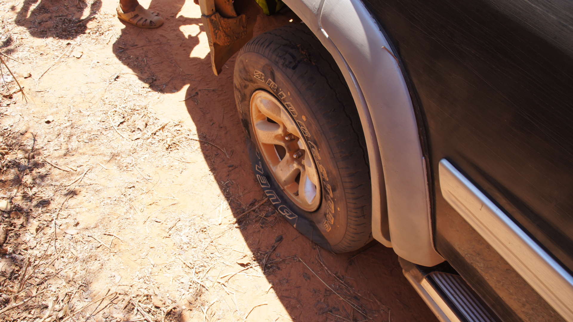 wir eine Panne hatten. Schon komisch, erst in diesem Augenblick haben wir uns überhaupt mit dem Gedanken einer Reifenpanne beschäftigt. Aber klar, wenn man die ganze Zeit über unbefestigte Straßen fährt ist es vielleicht auch nur eine Frage der Zeit.