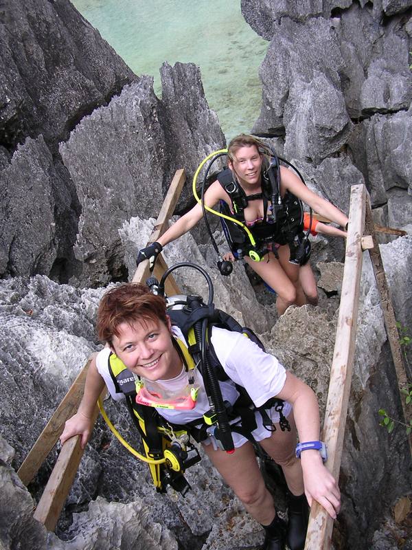 Anschließend geht es wieder langsam zurück. Kommt man dann in die normal temperierte Wasserschicht oberhalb von 14m, so wird einem sofort kalt. Aber man geniest auch wieder den fantastischen Blick auf die Gesteinsformen. Am Ausstieg kann man dann noch mit den dort sehr neugierigen Garnelen spielen bevor man im Wasser wieder sein Tauchequipment auszieht und die Kletterpartie zurück zum Boot antritt.