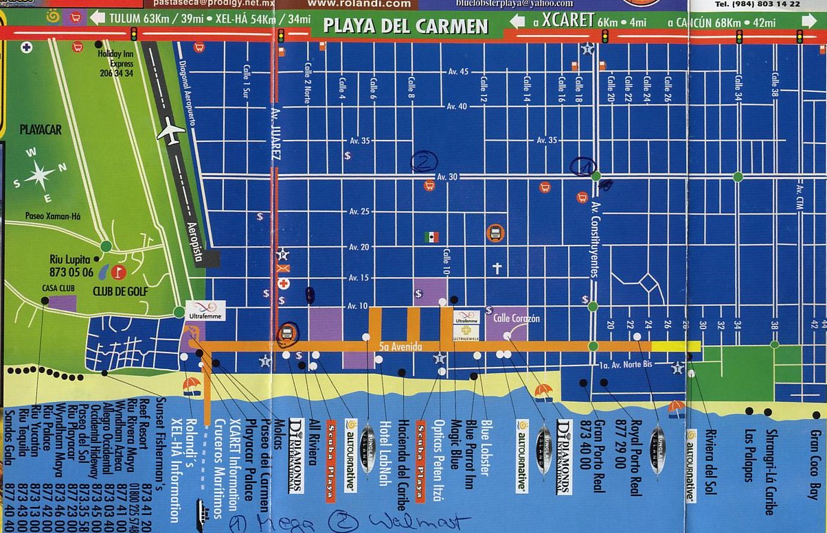 Wir sind natürlich erstmal die 5a Avenida langspaziert. Fast das gesamte touristische Leben spielt sich entlang dieser Straße ab. Hier gibt es eine Menge an Restaurants und Cafés (zu Preisen wie in Deutschland), Läden mit touristischem mexikanischem Kunsthandwerk und in den Seitenstraßen Richtung Strand finden sich dann die Bars für die Abendveranstaltungen. Auch viele Taucherläden kann man hier finden. Wer sich jetzt über das Rechteckmuster wundert: Playa del Carmen ist eine am Reisbrett entstandene Stadt. Die wenigen alten urtümlichen Ortsbestandteile sind längst Vergangenheit. Bis auf einige wenige Straßen, wie hier an diesem Kreisverkehr, ist die 5a Avenida komplett verkehrsfrei und auch von den Touristen ist um die Mittagszeit hier wenig zu sehen.