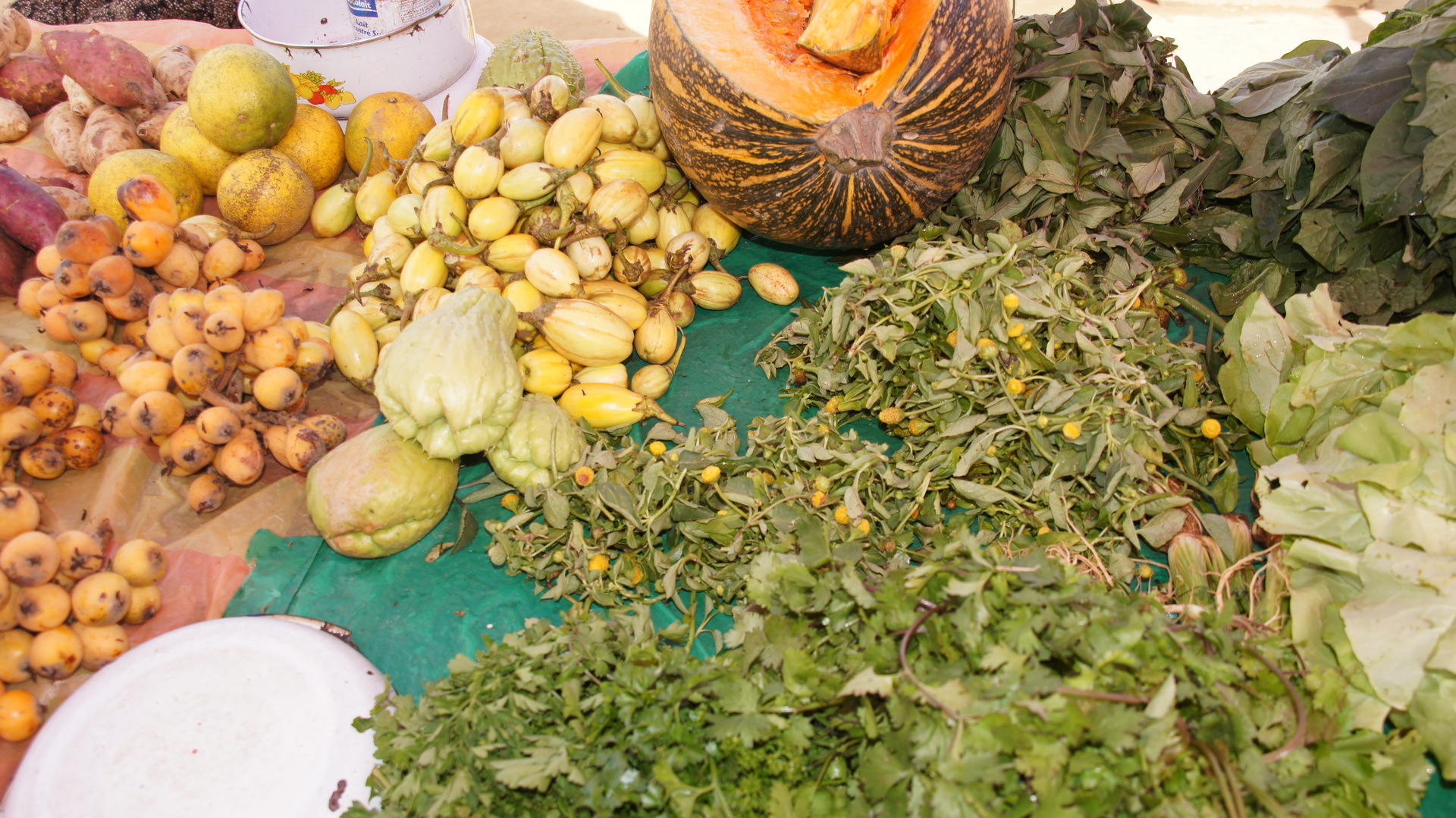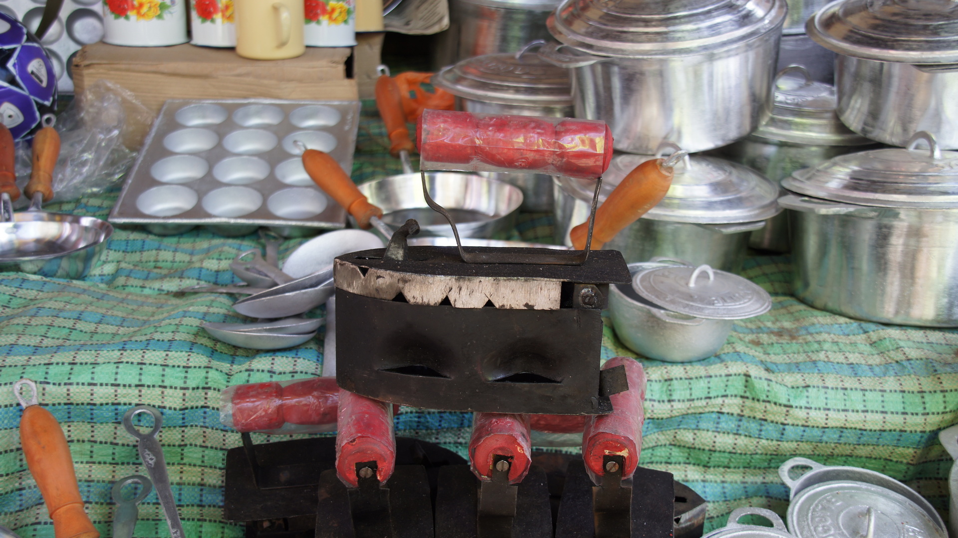 Das Angebot an den Ständen bestand teilweise aus selbst geernteten Gemüse und Obst, das die Bauern teilweise über mehrere Stunden zum Markt transportiert hatten. Wir konnten das mal beobachten, wo wir morgens Leuten begegnet sind, die auf einem kleinen Karren beladen mit Früchten unterwegs waren. Unser Guide erklärte daraufhin, dass die Leute auf dem Weg zum nächsten größeren Markt sind, um dort ihre Ernte zu verkaufen. Aber auch Dinge des täglichen Lebens, wie Töpfe oder das unten fotografierte Bügeleisen konnte man kaufen.