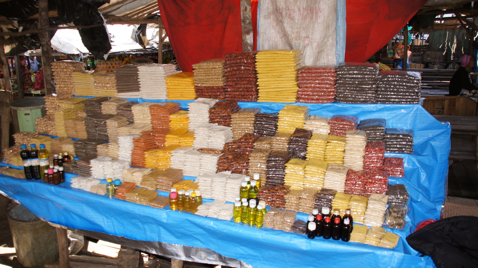 - Die Stände, die noch lose Schüttung verkaufen, befinden sich im inneren Teil des Marktes. Die Touristen meiden aber oft diesen gedrängten Abschnitt inmitten vieler Menschen und kaufen dann lieber an den äußeren Ständen, wo auch gleich die Preise höher sind, und es fertig abgepackte Ware gibt.