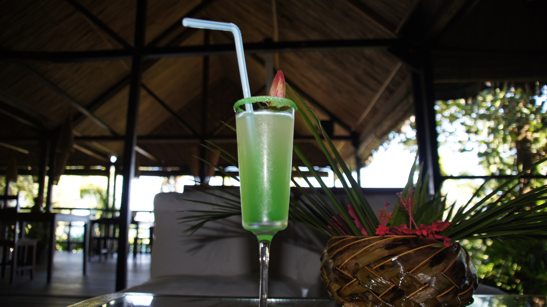 Vor dem ganzen formalistischen Kram gab es erstmal einen Begrüßungscocktail im Restaurant und gleich ein wenig Smalltalk. In der Zwischenzeit wurde unser Gepäck in den Bungalow gebracht und nach dem Cocktail wurden sehr schnell die Papiere ausgefüllt. Anschließend ging es wenige Meter durch die schöne Anlage zu unsrem Bungalow, schön am Strand gelegen, wenn auch etwas erhöht, dafür aber mit fantastischem Ausblick. Und der Weg zum Strand hinunter war nur wenige Meter entfernt.