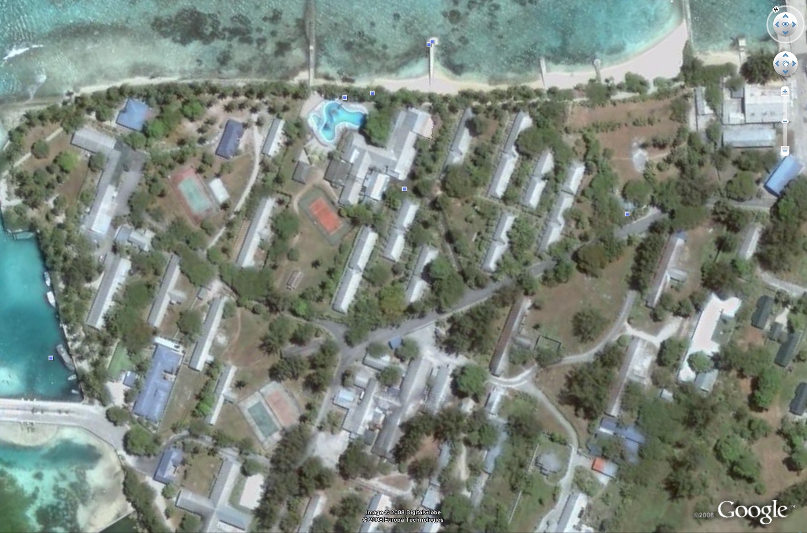 Ganz unten rechts sieht man den Flughafen und etwas westlicher an der Innenseite des Atolls liegt das Hotel. Diese vier Inseln, die ihr unten seht, sind alle mit einer Straße verbunden. Und Hier nun noch unser Hotel aus der Vogelperspektive.