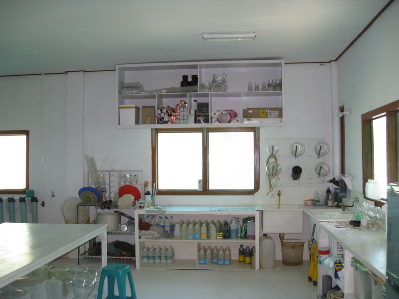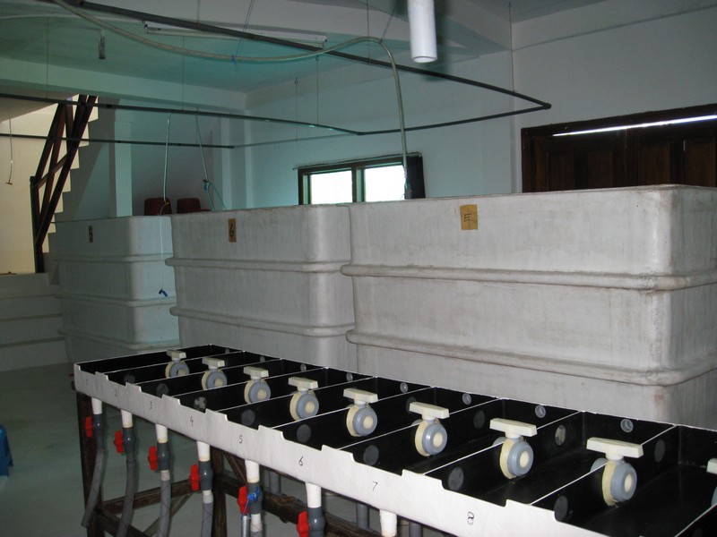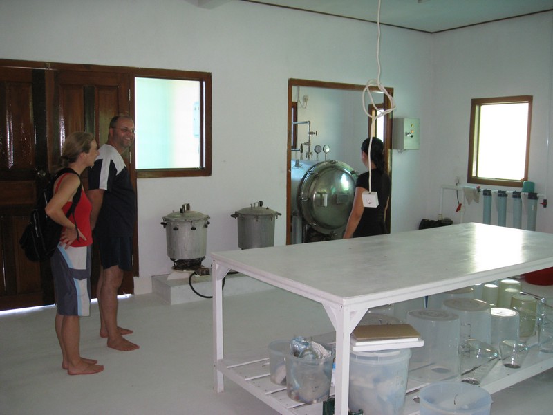 Um die 24 Stunden Tauch frei vor dem Heimflug einzuhalten, haben wir am letzten Tag die Gelegenheit genutzt und die direkt neben der Tauchbasis gelegene Perlenfarm besichtigt. Also schnell hinten aus der Basis raus und am Nachbargrundstück die große Treppe zum Eingang hoch. Da die Ausstellungs- und Verkaufsräume über den Werkstätten liegen, ist man so ca. auf der Höhe von einer dritten Etage. Da gab es gleich nochmal einen schönen Ausblick über das Meer, bevor man in die Tiefen der Perle einstieg.