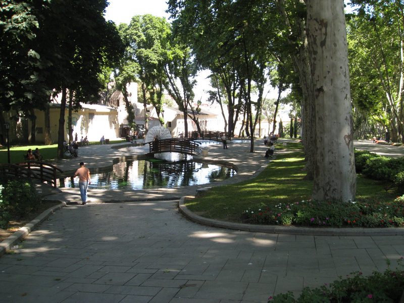 Unser Weg führte uns inmitten eines Parks zwischen der Hagia Sofia und der blauen Moschee. Wir haben gleich die Gelegenheit genutzt, um ein wenig zu trinken und einfach den Blick ins Grüne zu richten.
