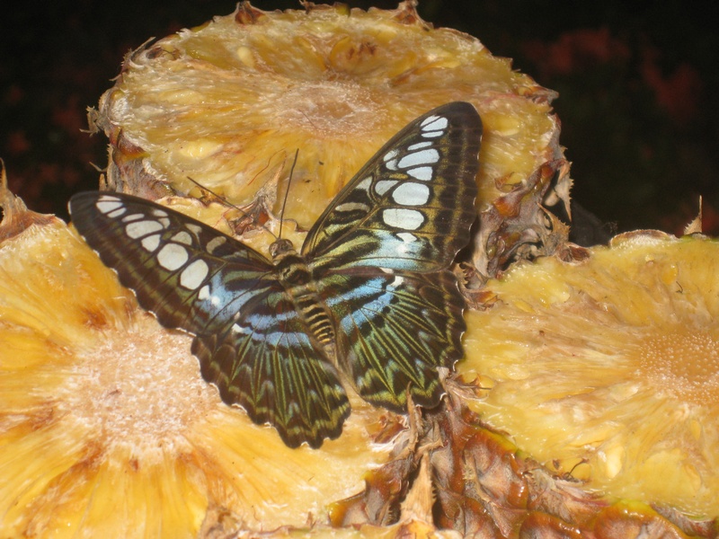 Die vielen Schmetterlinge um schwirren einen, sodass man sich schon ein Tier explizit aussuchen muss, um es dann ein wenig zu beobachten. Für die Tiere sind zusätzlich zu den blühenden Pflanzen noch viele kleine Fütterungsstationen vorhanden, an denen sie sich genüsslich mit Nektar und Saft vollsaugen und dabei so vertieft sind, dass auch eine Detailbeobachtung ganz nah dran möglich ist.