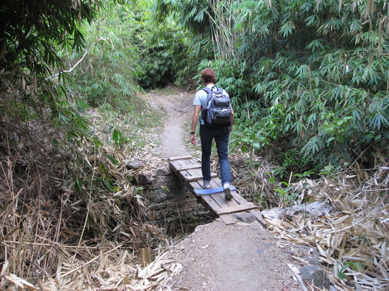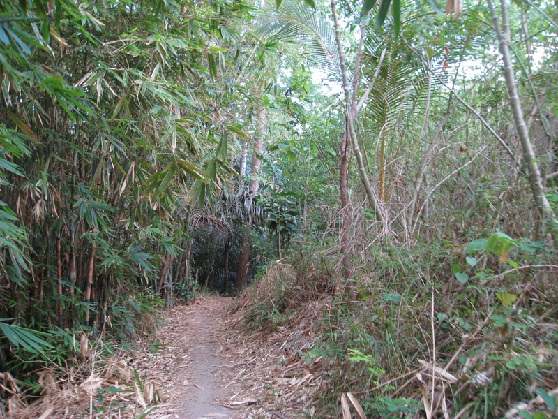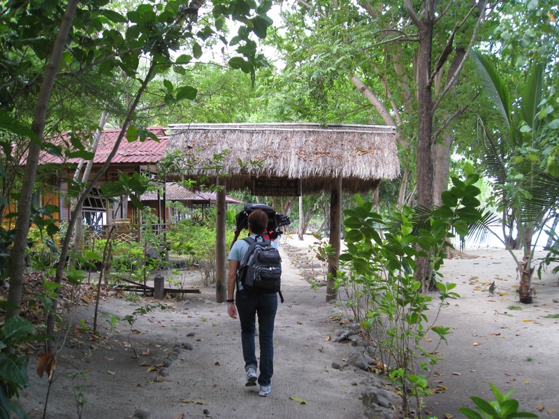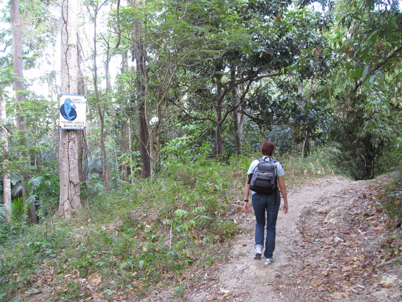 Die Straße endete ziemlich schnell und nur ein kleines Schild zeigte uns den Weg ins Pulisan Jungle Beach Resort und dem Happy Dugong Dive Center. Also ab in die Wildnis. Es ging über kleine Brücken und mitten durch einige Felsbrocken. Nach ca. 20 Minuten haben wir den Eingang zum Resort erreicht. Endlich da!