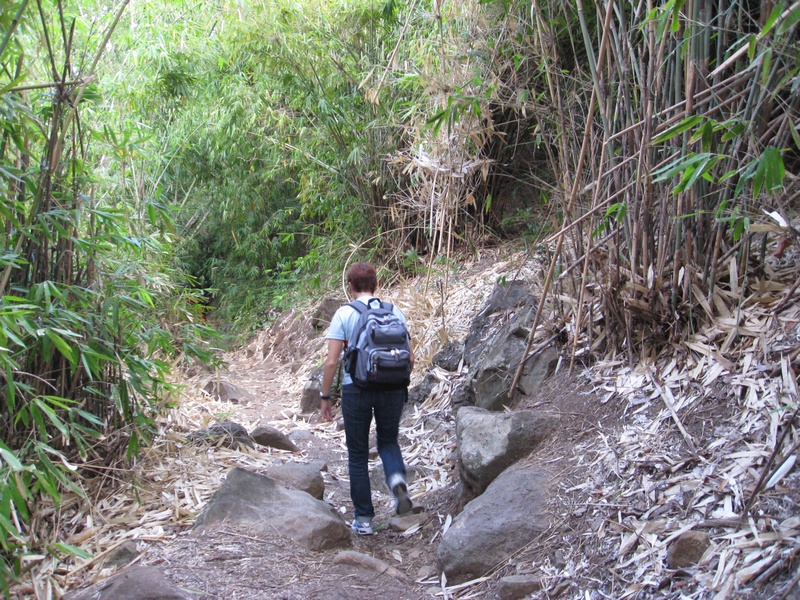 Auch diese zwei Stunden gingen schnell vorbei und der Wagen hielt in einer Straße auf Höhe der letzten Häuser. Sofort kamen ein paar Leute …- …und guckten. Vor allem die Männer taten sich mit viel Diskussion hervor, aber das Gepäck wurde von den Frauen geschultert und das in direkter Bedeutung der Worte. Einen kleinen Rucksack vor den Bauch, einen kleinen Rucksack auf den Rücken und den schweren Tauchrucksack auf den Kopf. So ging es auf die letzte Station der Anreise, dem Fußweg durch den Dschungel.