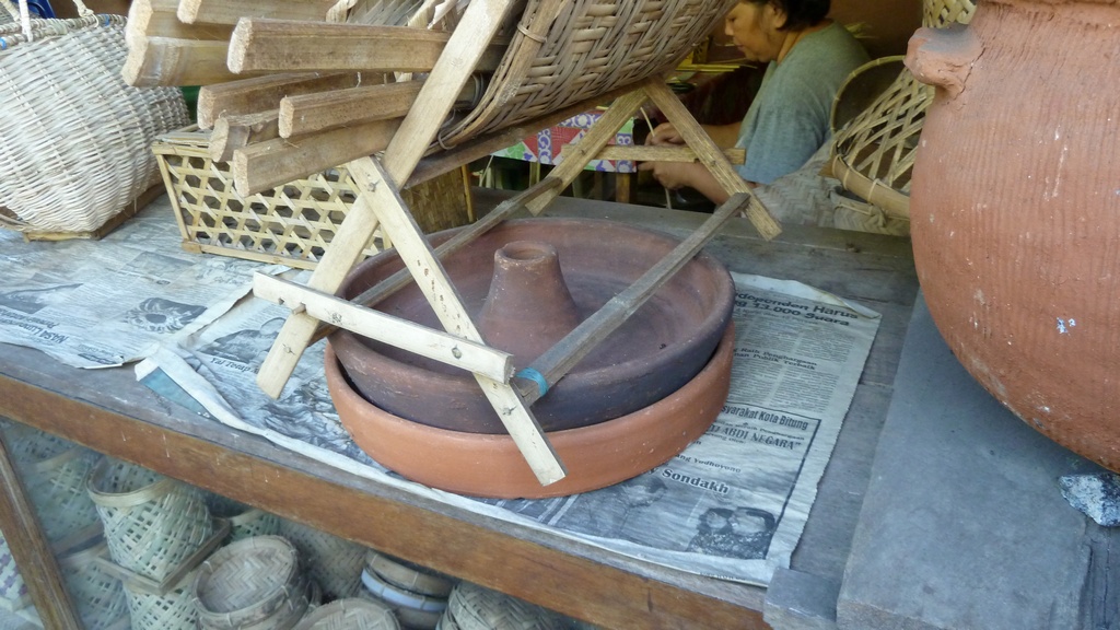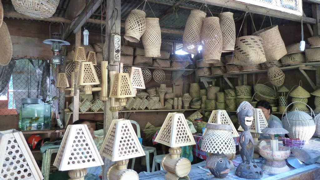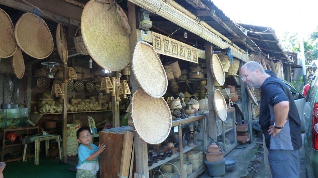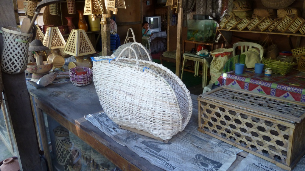 Auf dem Weg zu unserem ersten Ziel, dem Markt der Einheimischen in Minahasa, gab es auch schon den ersten Zwischenstopp in einem kleinen Dorf. Auf der linken Seite war die Straße im ersten Abschnitt voll mit Läden, die Körbe, Fächer, Taschen, Schalen usw. anbieten. Alles aus Wassergras, Bambus und Ton hergestellt.