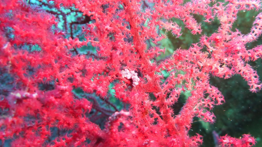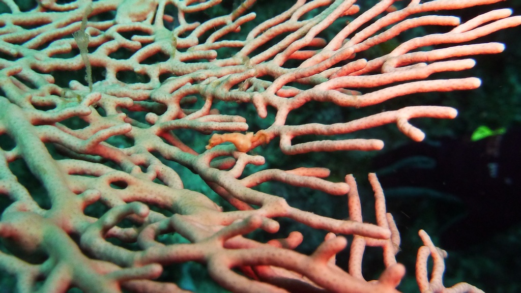 Bevor wir jetzt zum Anschluss nochmal auf etwas größere Tiere zurückschwenken, genau genommen zu zwei Haien, wird es nochmal viel kleiner, und danach nochmal etwas besonderer. Da wären als Erstes die kleinen Seepferdchen. In der gleichen Größenordnung gibt es dann auch noch kleine Putzergarnelen auf den Federsternen. Wobei, Nachts muss man besonders viel Glück haben mal eine zu finden und dann auch noch aufs Foto zu bannen.