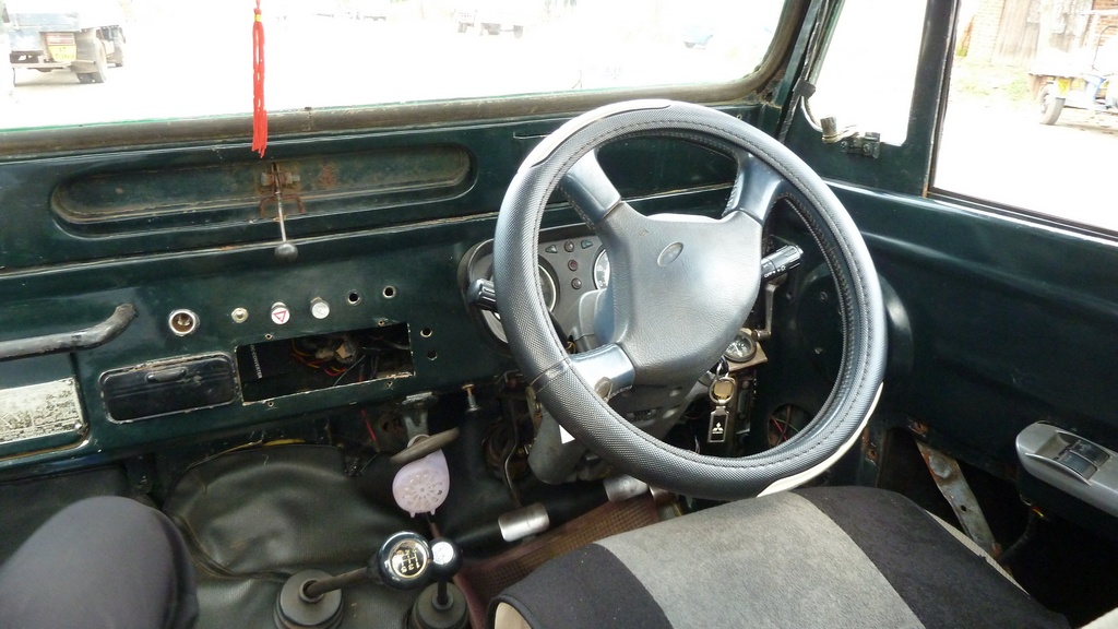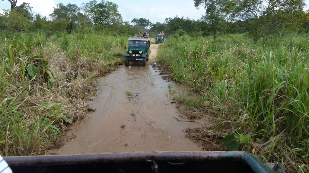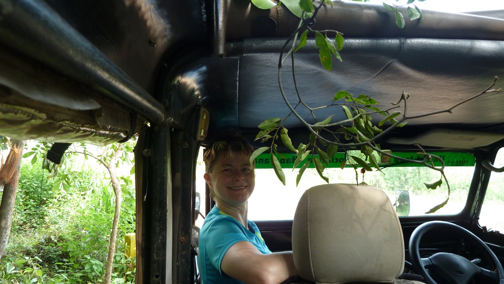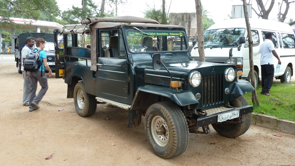 Wir hielten an einem kleinen Restaurant am Rande der Straße für einen leckeren Imbiss und kamen mit dem Restaurantbesitzer ins Gespräch, der uns auch gleich geschäftstüchtig noch eine kleine Safari zur Elefantenbeobachtung vermittelte. Dass sich diese Safari zu einem wirklich positiven Abenteuer entwickeln würde und uns viel Spaß bringen sollte, konnten wir zu diesem Zeitpunkt noch nicht erahnen. Erstmal ging es weiter in unseren Zielort, aber statt ins Hotel dort zur ‚Safari Sammelstelle‘. Während hier die Gäste auf die verschiedenen Jeeps verteilt wurden, mussten wir auf unseren Jeep bzw. Fahrer noch warten, der aber auch schon kurz nach uns auf den Hof fuhr. Ab jetzt wurde es interessant. Als Erstes mal ein paar Bilder von ‚unserem Jeep‘. Man achte insbesondere auf die Bereifung.