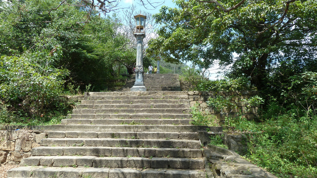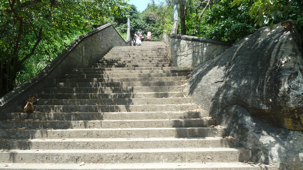 Nach diesem kurzen Zwischenstopp ging es aber zügig weiter zum goldenen Tempel, der größten Tempelanlage auf Sri Lanka. Allerdings ist das, was man hier von der Hauptstraße aus sieht, der untere Eingang und der Parkplatz u. a. für die großen Busse. Der Weg führt dann erst noch den Berg hinauf bis zur eigentlichen Tempelanlage. Mit einem kundigen Fahrer kann man aber auch auf halber Höhe mit der weiteren Bergbesteigung beginnen und erspart sich damit nicht nur die anstrengende Kraxelei, man spart einfach auch 1 Std. an Zeit. Auch wenn der Weg gut ausgebaut ist, mit vielen Stufen, es geht immer noch gut Bergauf. Der Anblick vor dem eigentlichen Eingang über die Berge entschädigt aber schon mal.